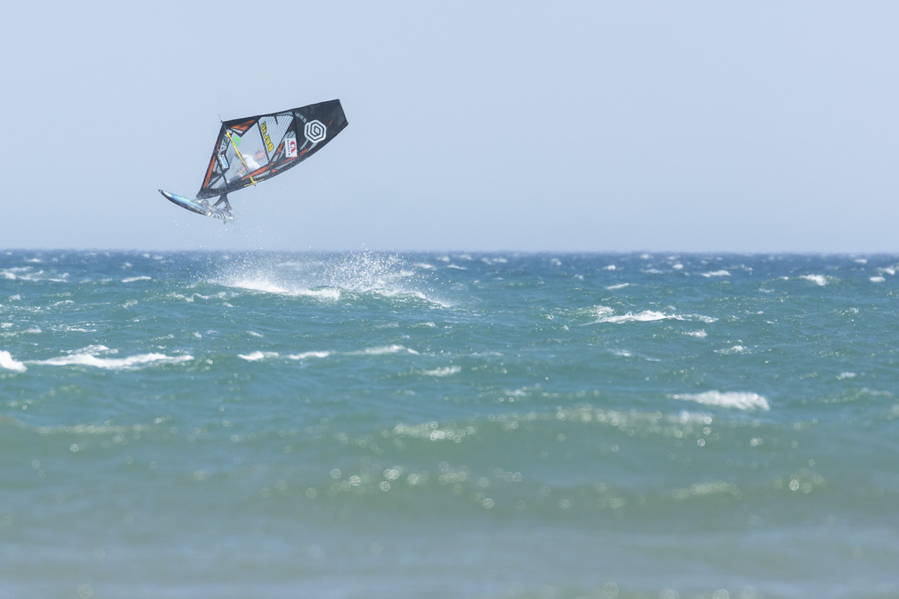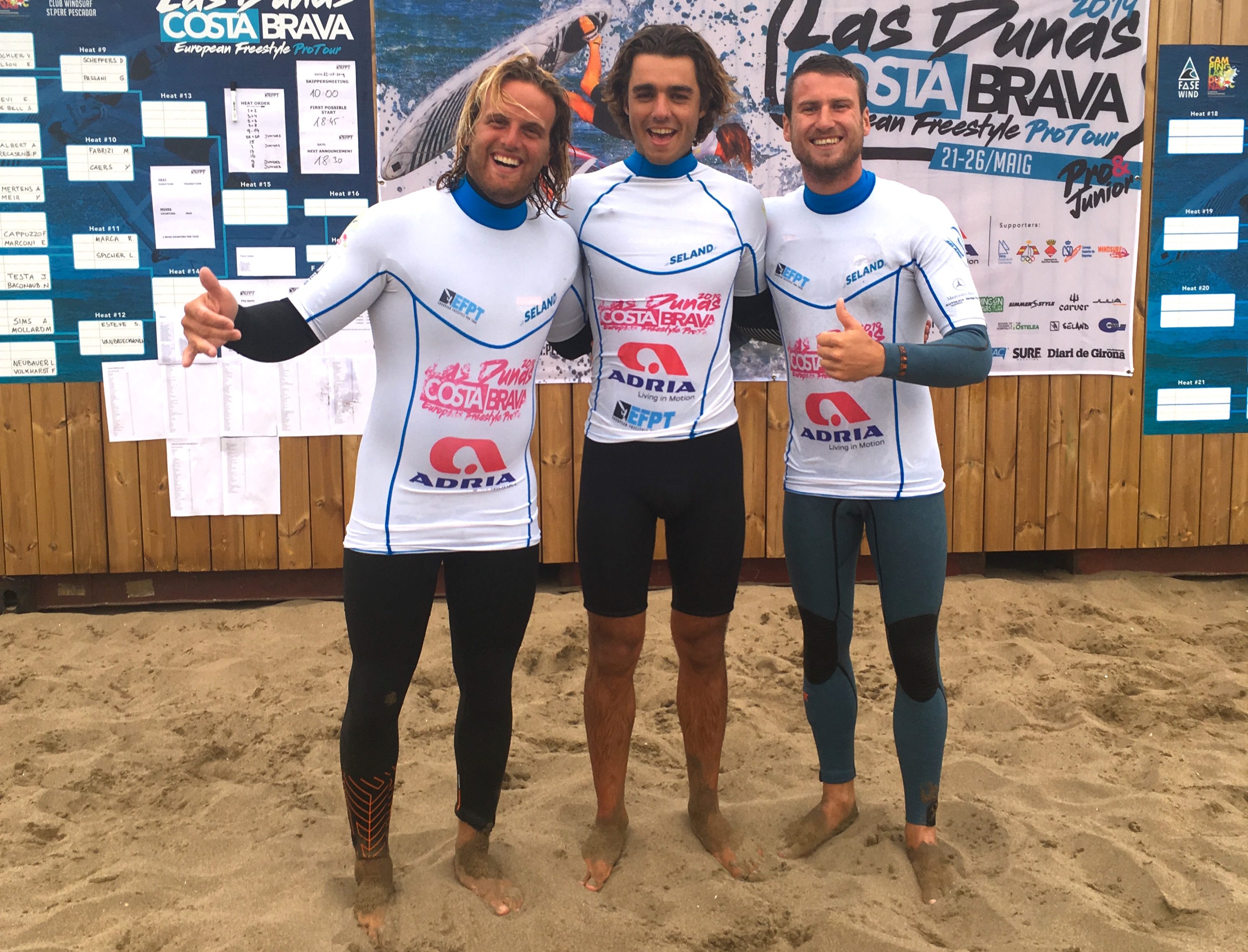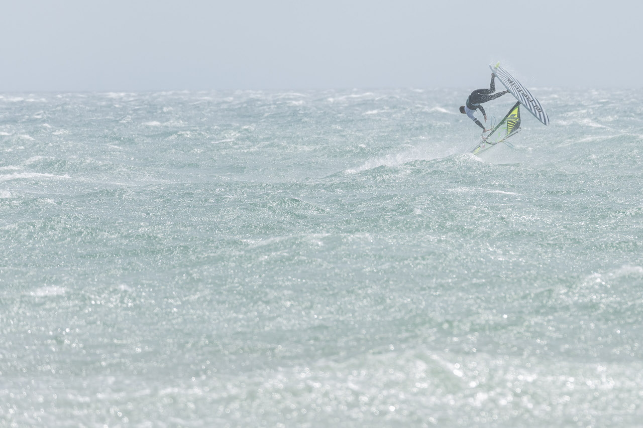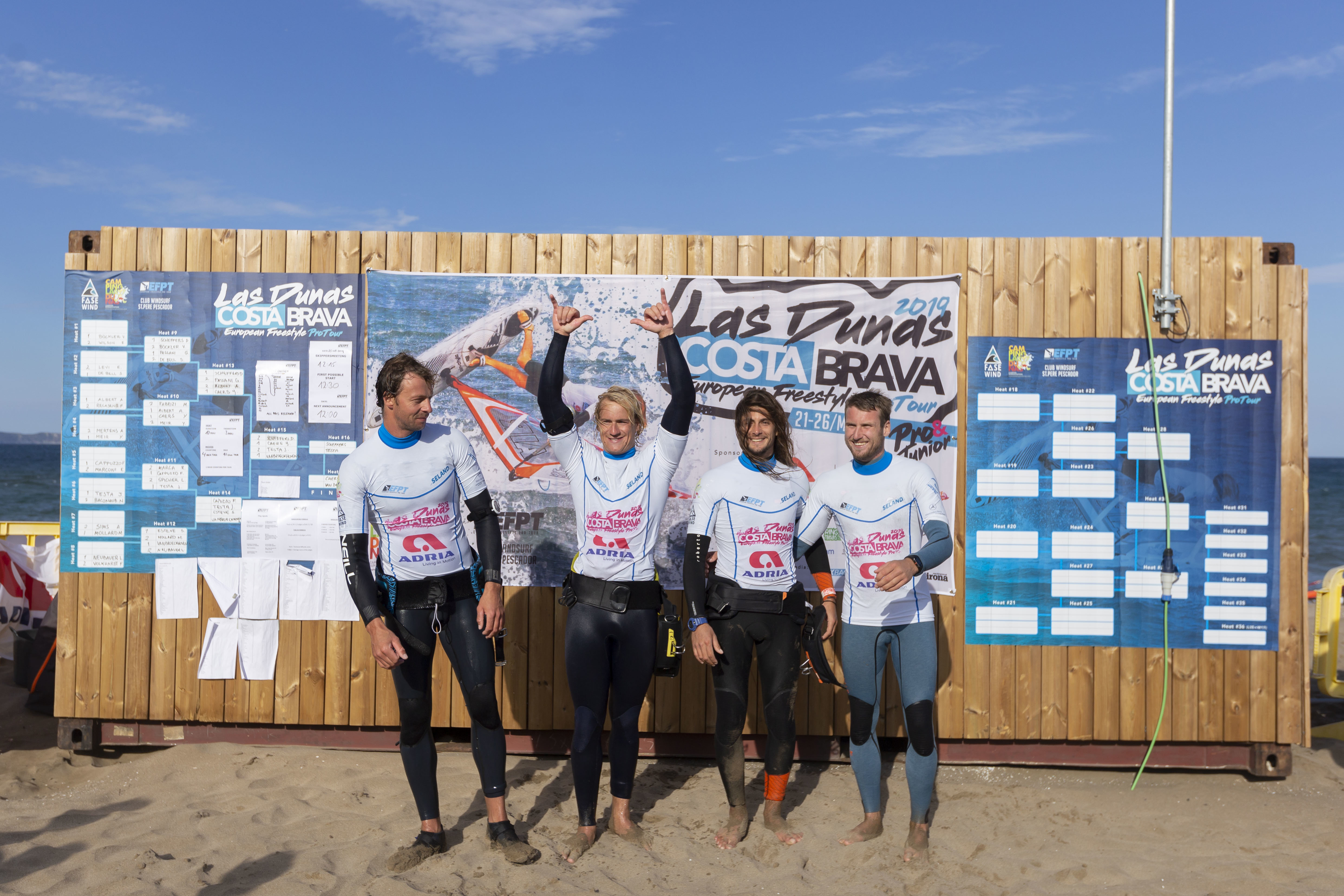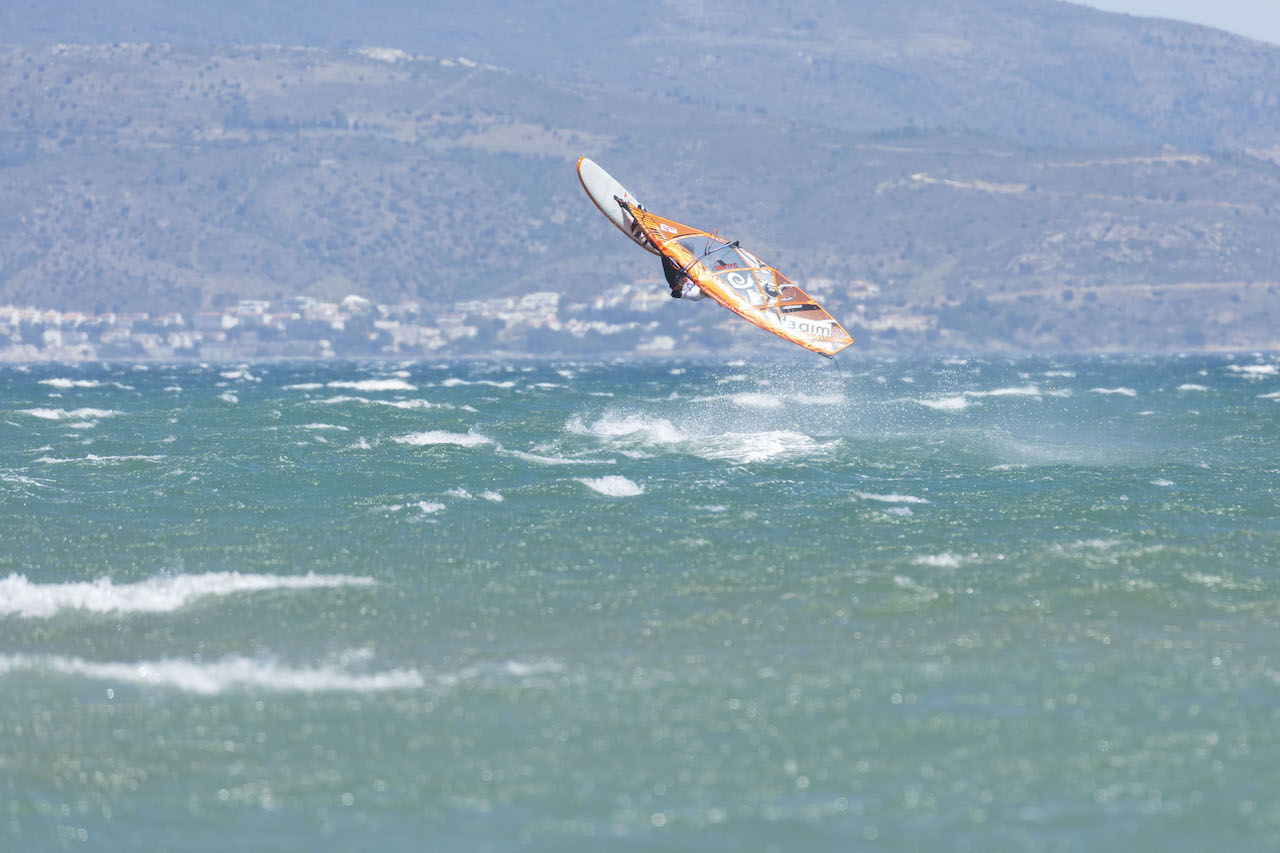 The ultimate day here at the EFPT Las Dunas Costa Brava has been all about the double elimination in howling winds with more to 40 knots at times. The riders started off on their 4.4s but had to rigg down to their 4.0s and below fairly soon. What seemed like a beautiful illusion at the start of the week, became reality today and provided the perfect playground for the remaining freestyle competition.