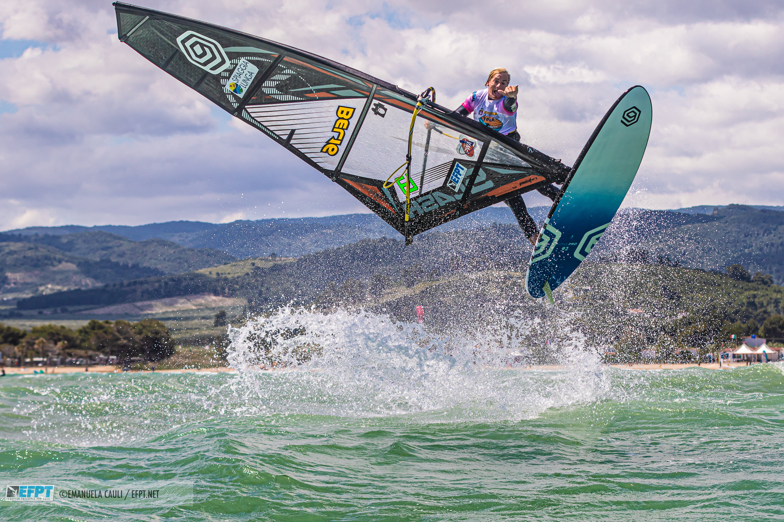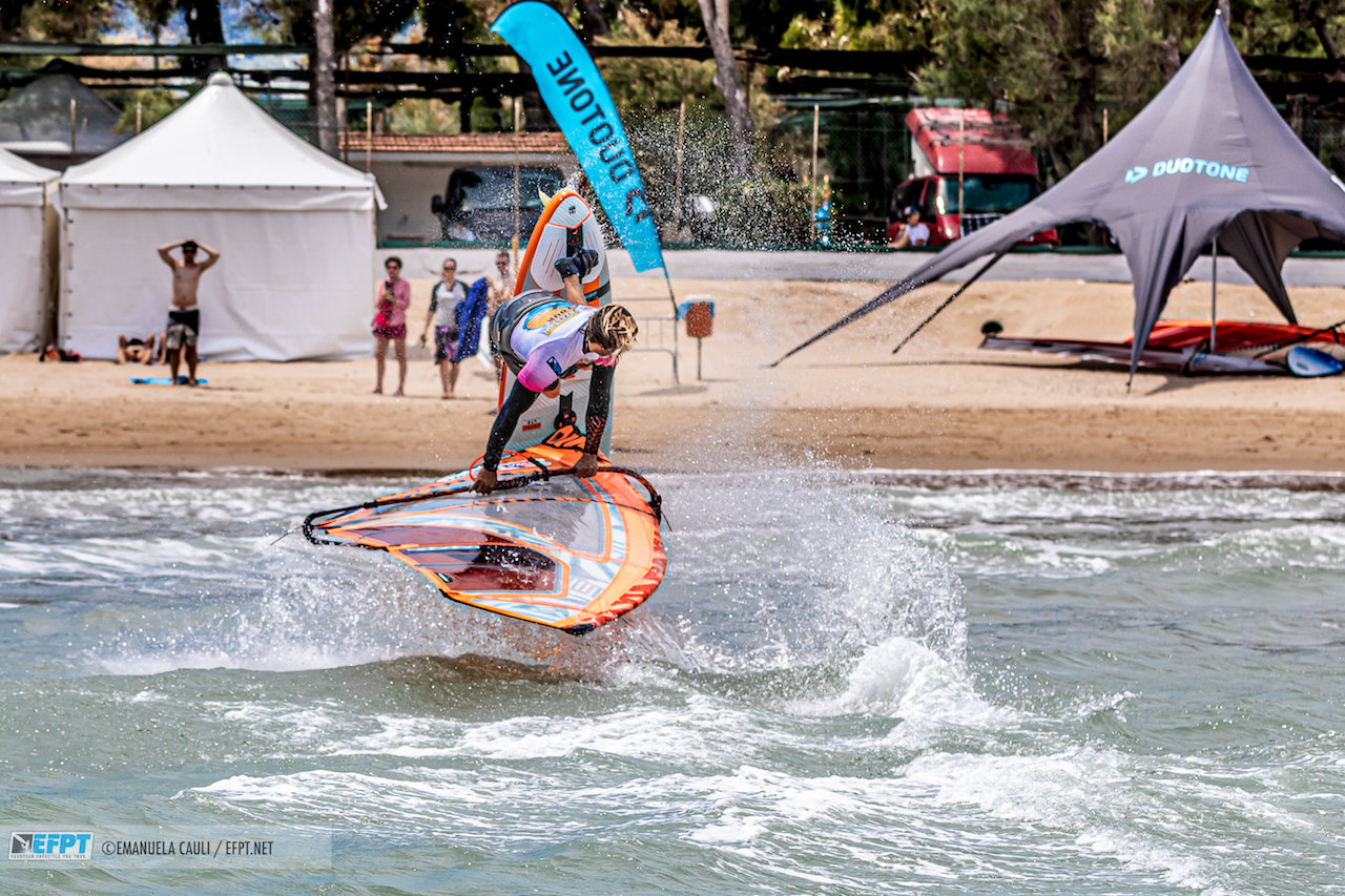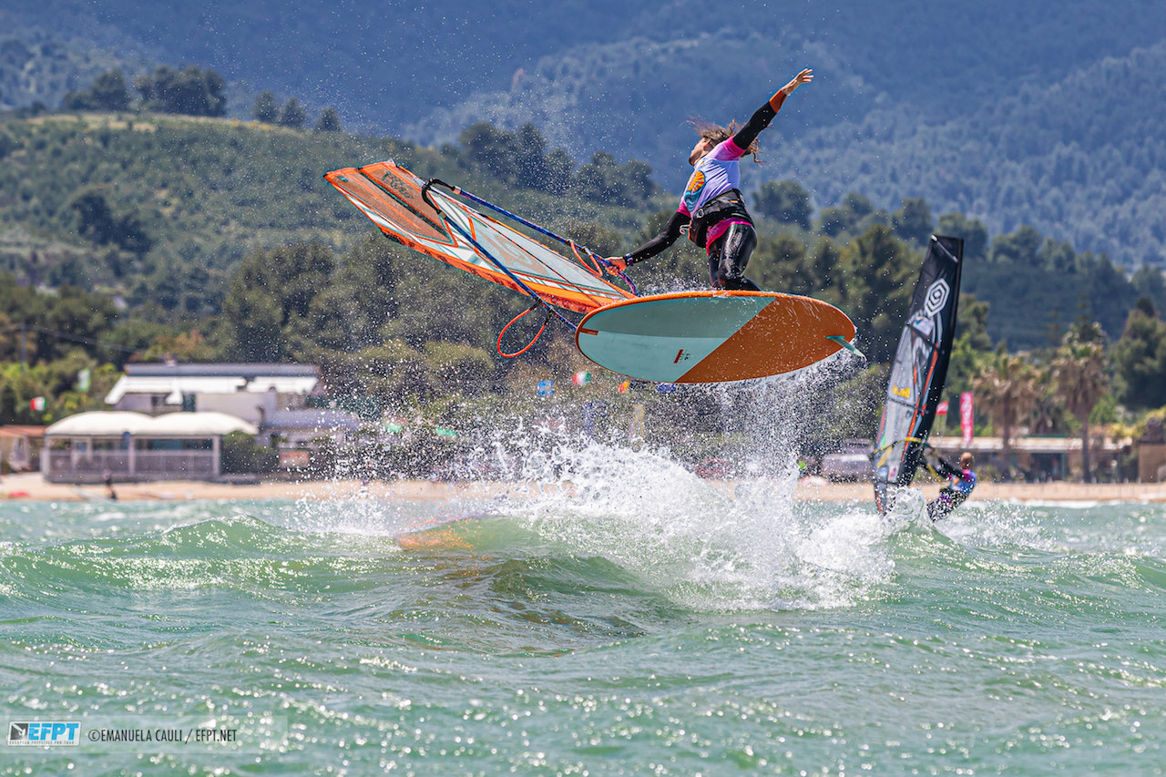 At the ultimate day of the EFPT Spiaggia Lunga Village, the wind remained light throughout the whole morning and  the competition had officially been called off by 12.00 midday, as there had been no improvement of the conditions. The result of the first double elimination therefor remains and makes Yentel Caers the event winner here in Italy.